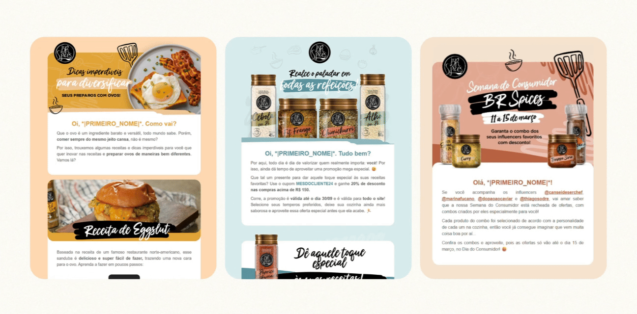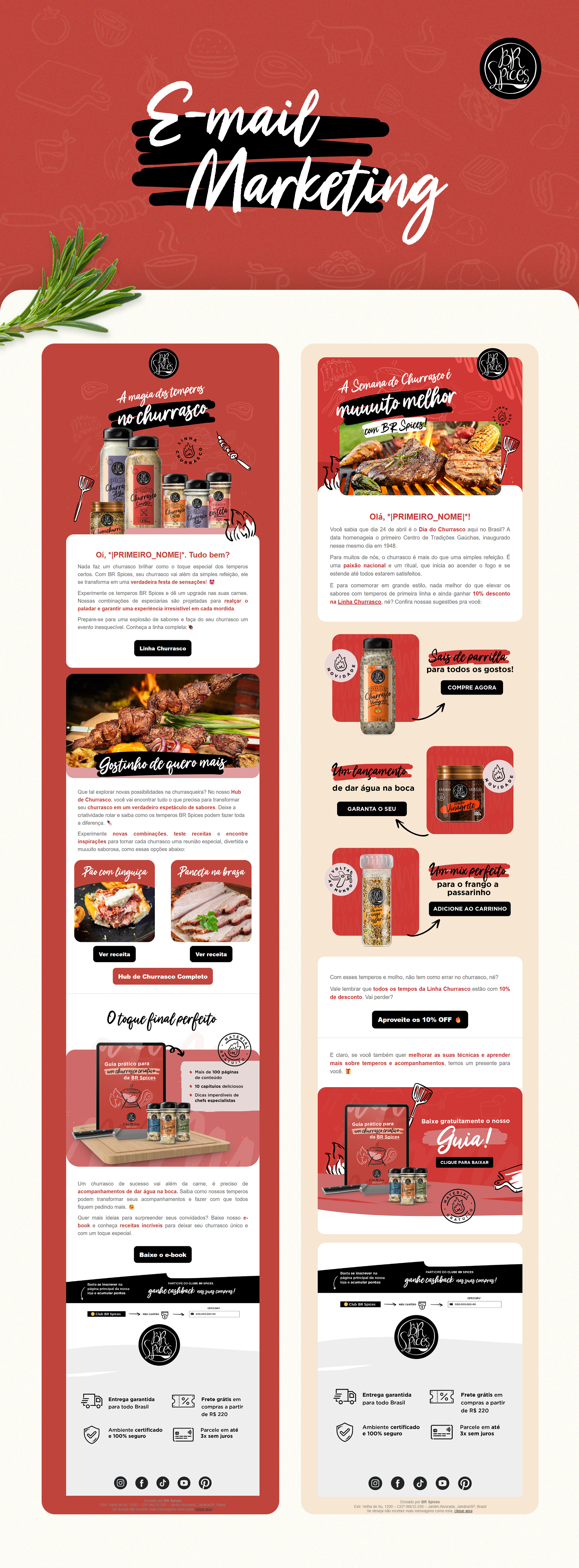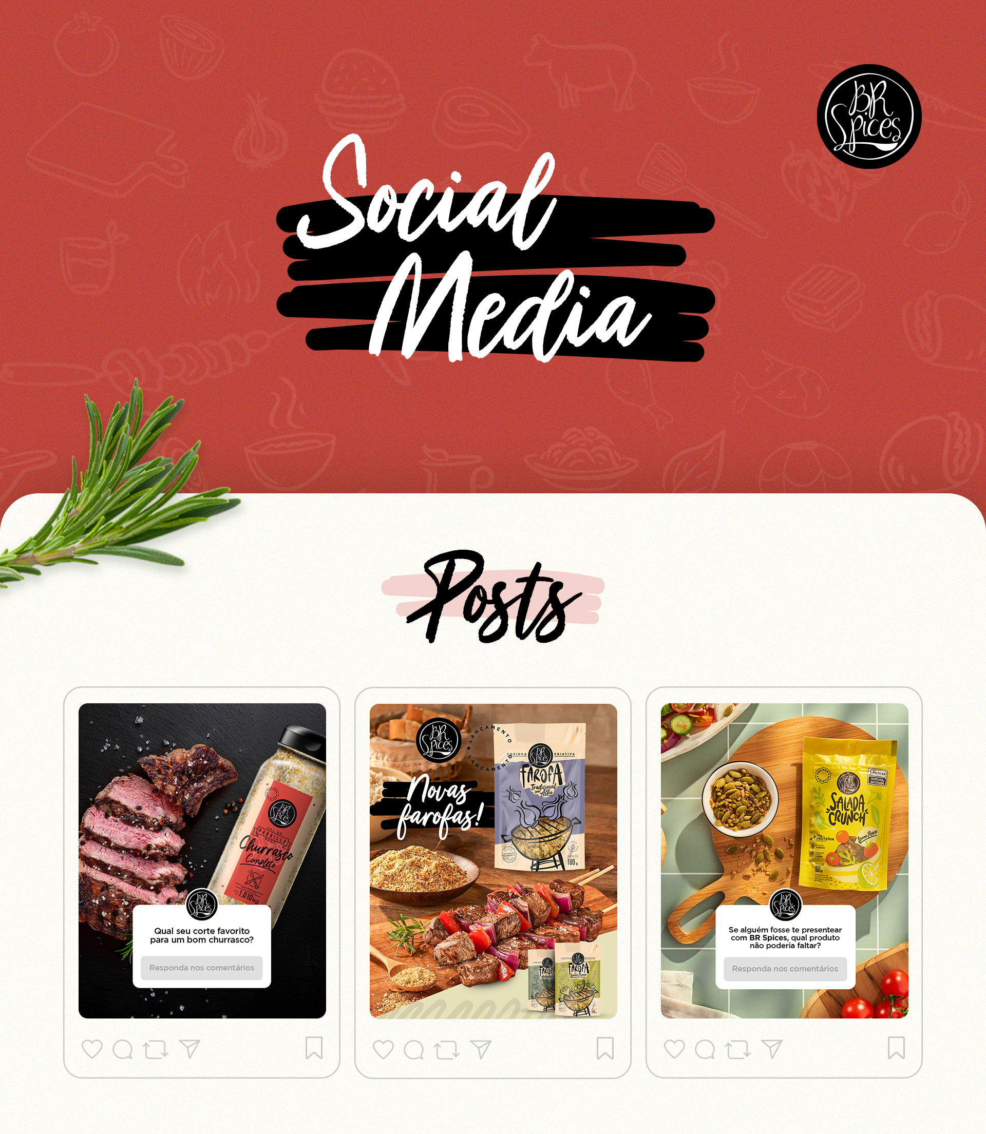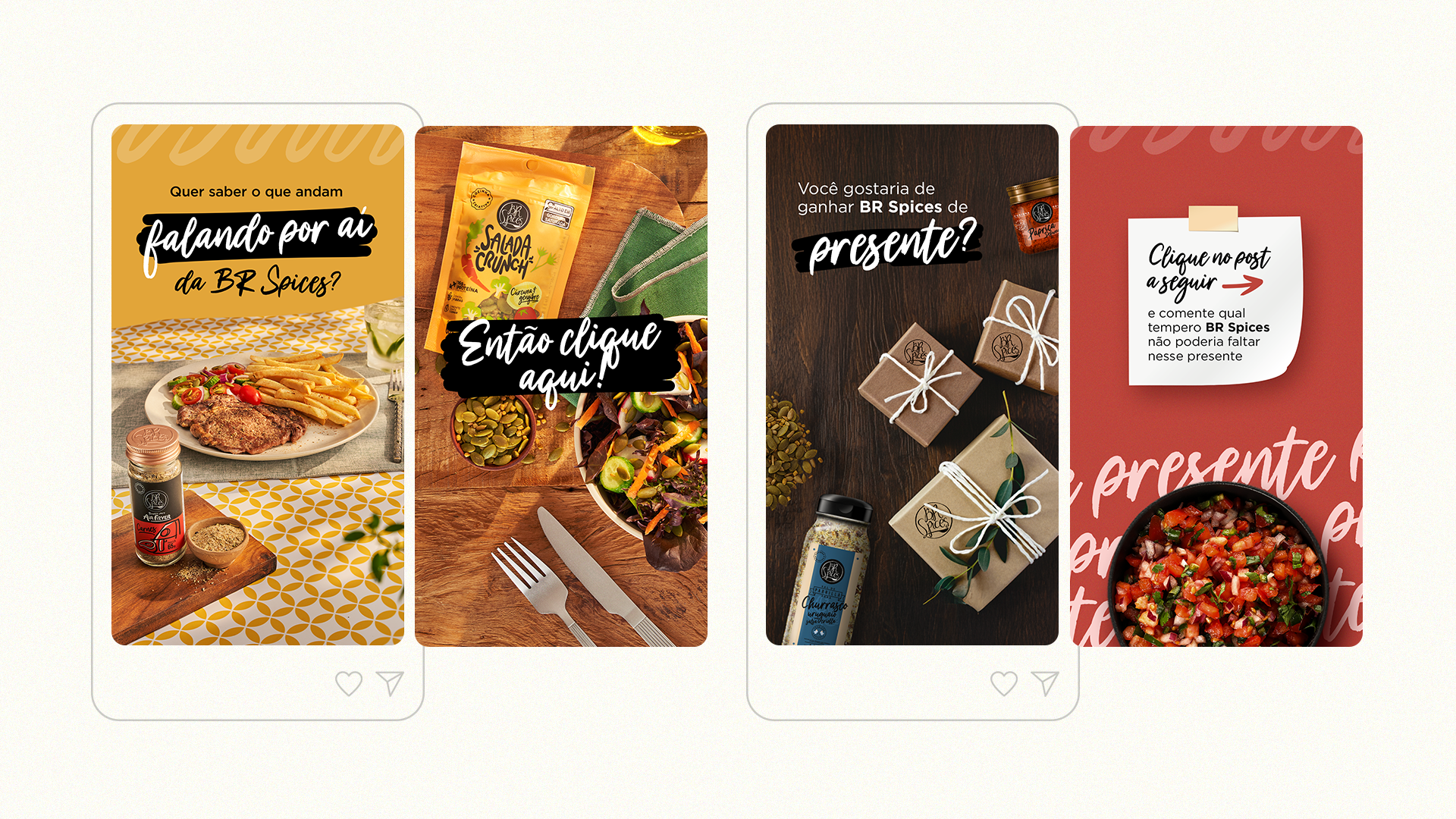 Criação de peças digitais para BR Spices, incluindo posts estáticos, carrosséis, animações e e-mails marketing. O projeto teve como objetivo traduzir o posicionamento da marca para uma comunicação visual mais viva e gastronômica, explorando textura, cor e linguagem sensorial para aproximar o produto do momento de preparo e consumo.