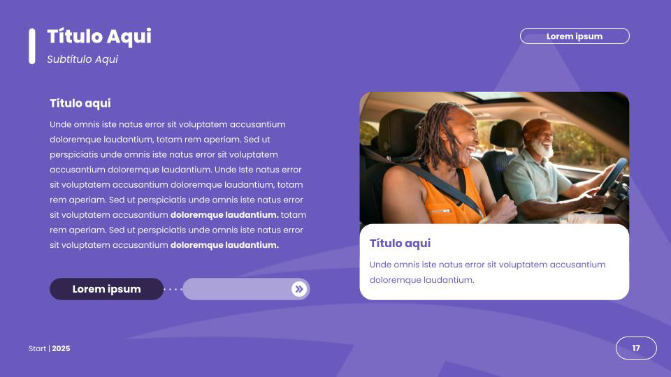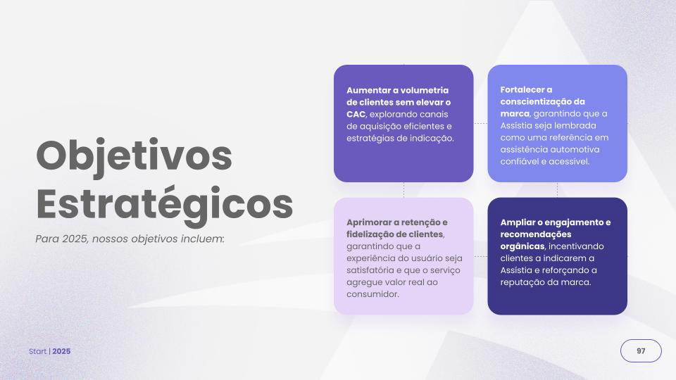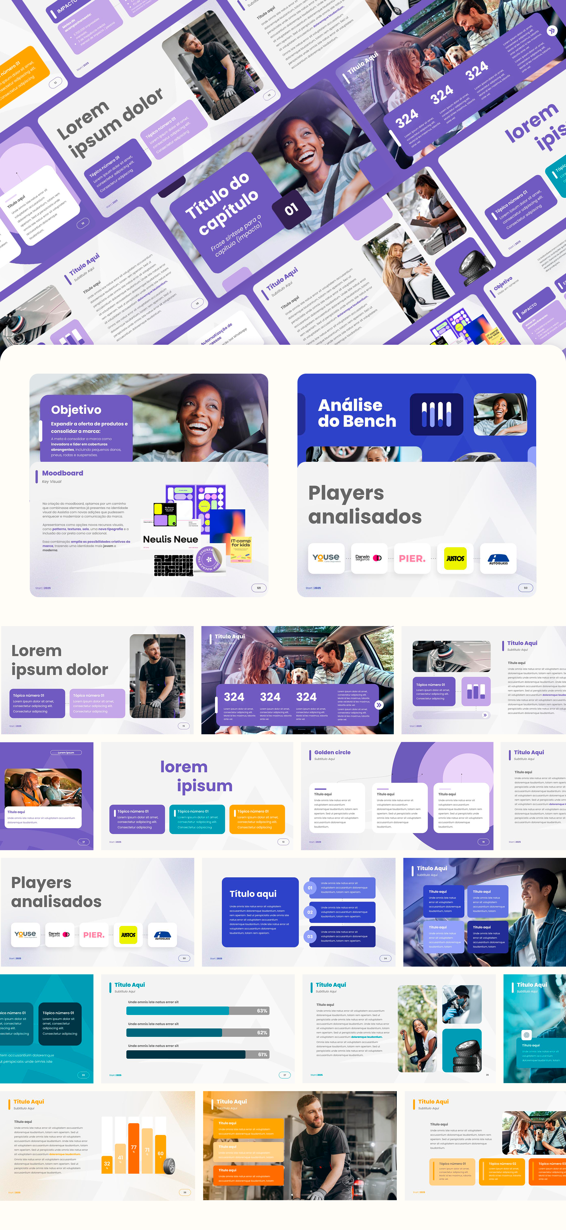 Desenvolvimento de uma master institucional para as apresentações anuais da Assístia, com foco em dinamismo, clareza e adaptação modular para diferentes conteúdos estratégicos. O projeto explora e expande a paleta de cores da marca, criando uma linguagem visual consistente e funcional para dados, benchmarks e contextos institucionais. O resultado é uma apresentação versátil, moderna e alinhada ao posicionamento da empresa no setor de assistência automotiva.